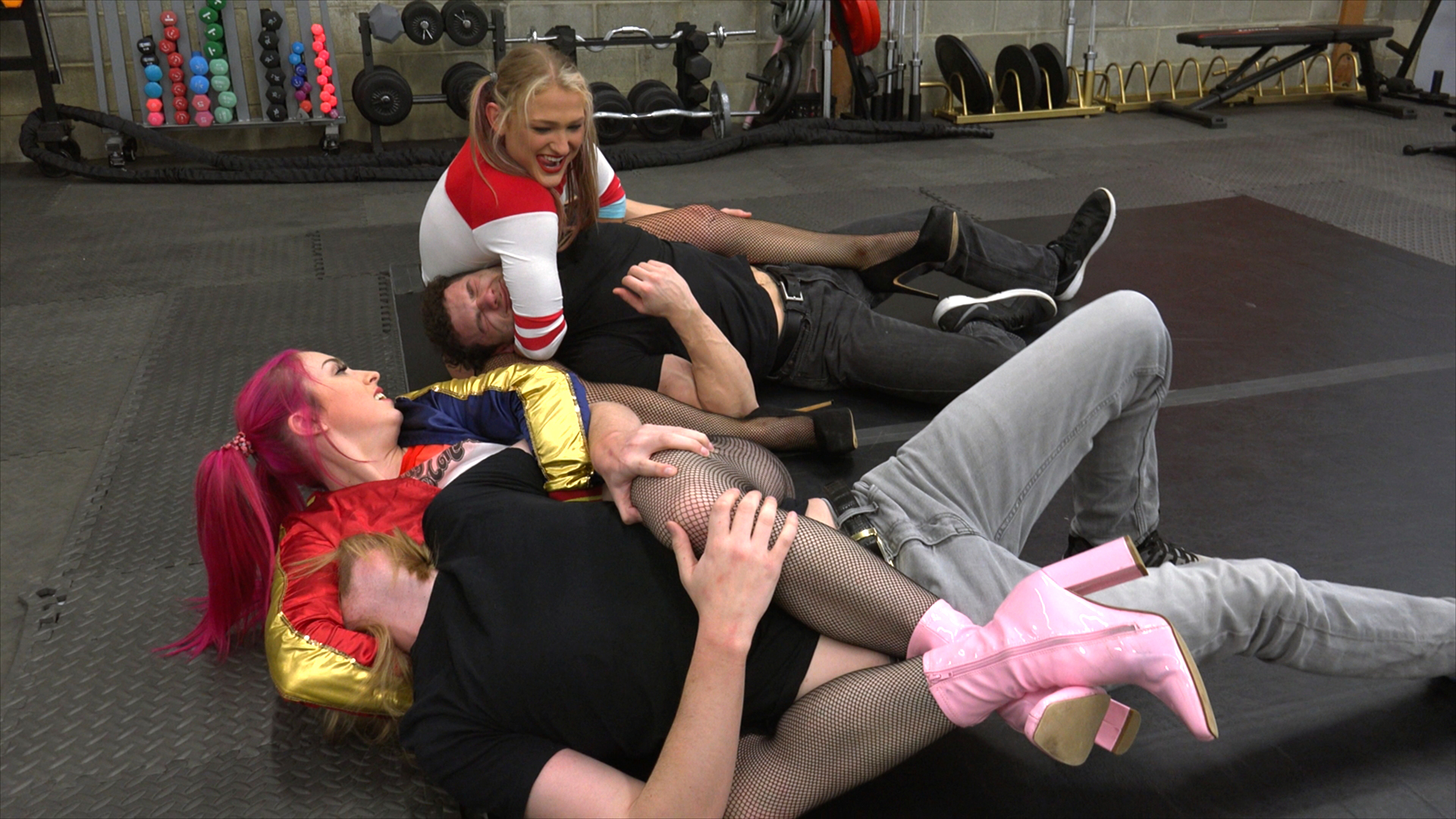 | | Stars: | Macy Nikole, Sunni Ray | | Genre: | Mixed Wrestling | | Hold: | Belly Punching, Death Grip, Facesit, Figure 4, Flexing, Grapevine, Head Scissor, Hip Thrust, HOM Smother, Reverse Facesit, Reverse Figure 4, Reverse Head Scissor, Scissor Snaps, Straddle | | Description: | NEWS FLASH: Anti-hero Harley Quinn has a twin sister! They both make an appearance in this weeks members' offering, UTCS-224, The Quinn Sisters! Beautiful, built session girls Macy Nikole and Sunni Ray cosplay the twins. Two rival crooks enter their warehouse in Gotham to steal their gym equipment and the twins catch them in the act. The Twins throw the men to the ground and commence to scissoring them, mirroring each other in grueling hold after intense hold. This is a 2 on 2 scissoring spectacle as each twin switches off occasionally to dominate the other gang member. Holds of note include: head scissors, figure 4, grapevine hip thrust, scissor snaps, flexing, reverse scissor, reverse figure 4, death grip, HOM smothering. In the end during dueling death grips, the Harley Quinn Twins decide to take the would-be thieves to see the Joker! He'll know what to do with them! UTCS-224, The Quinn Sisters! is 15 minutes in length and specially priced at only $12.95. Purchase the clip and get their contact info at the end. Enjoy!